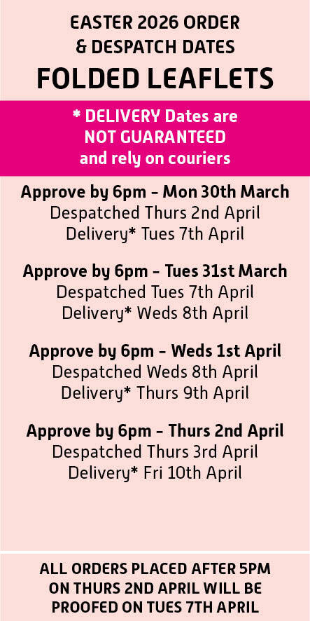 All orders placed after 5pm on Thursday 2nd April will be dealt with on Tuesday 7th April 2026.