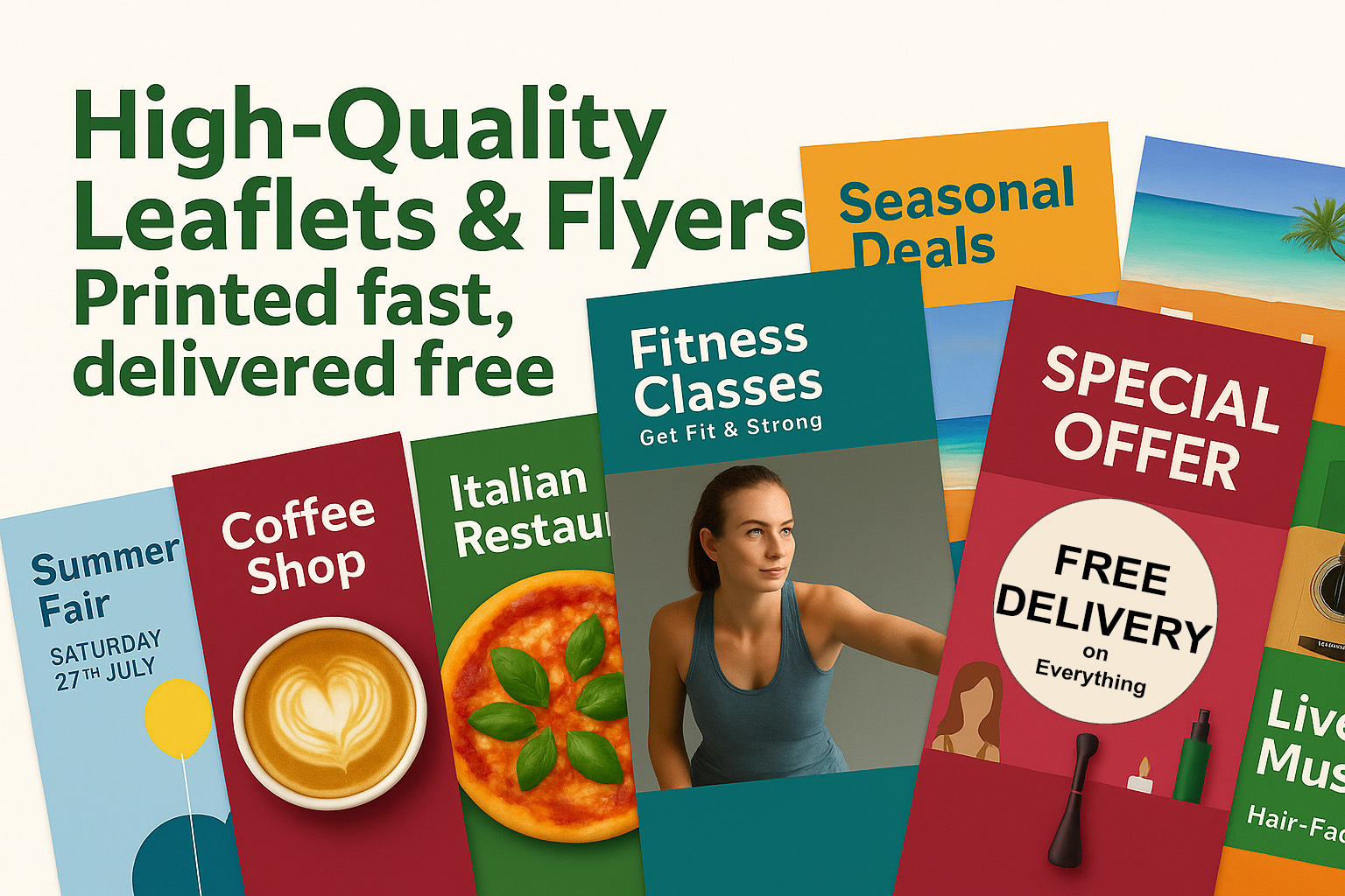 Choose from A4, A5, A6, DL and more sizes, single or double-sided, flat or folded. Every order includes free UK delivery and PDF proof for approval, so there are no hidden extras.